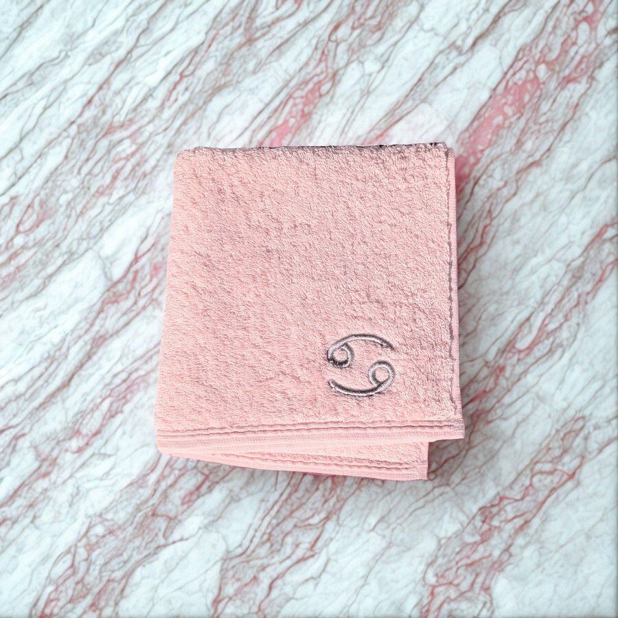 蟹座のアストリア ピンクタオルは、水のエネルギーを象徴する蟹座の感受性と直感力と共鳴するよう設計され、蟹座の星座記号を銀糸で繊細に刺繍しています。